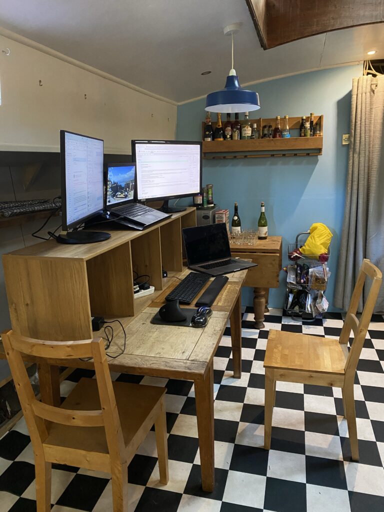 At the end of the day I moved the office downstairs and onto the kitchen table, where it can stay until the wheelhouse has been sorted out. With the boats in quite a public location, leaving a lot of computer equipment on display was not a good idea, anyway. The new office is working well, and isn’t in the way at all, so that is one problem solved.
